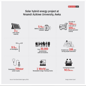 In NAU is an operational solar-hybrid plant with 2MW solar PV capacity and comes equipped with a diesel backup system built at the cost of N3.5billion (N3.1bn has been disbursed to date).