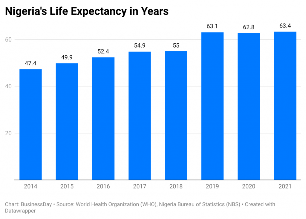 BusinessDay’s World Health Organisation (WHO) data analysis shows that life expectancy grew by 22.6 percent from 51.7 years in 2014 to 63.4 years in 2021 and has stagnated until 2024.