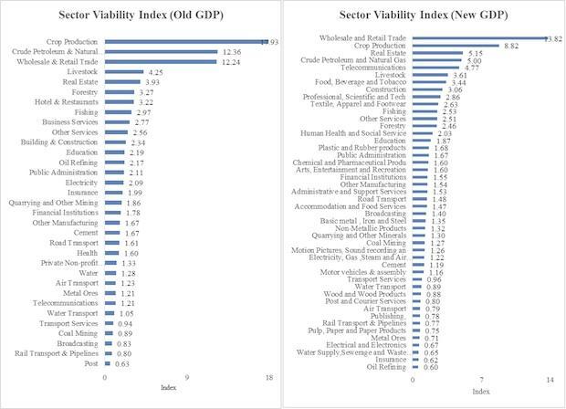 Telecoms, construction, crop production and human health and social services are other notable sectors that have emerged in the top 10 resilience chart that were absent in the old series. Oil refining, accommodation and food services are some of the key sectors that have receded in resilience, and now occupy the bottom 10 of the chart in the new series, from their enviable positions in the top 10 of the old series. The implication of this is that the growth of these sectors have become more volatile, which suggests higher risk.