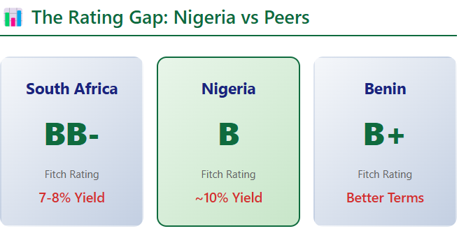 As of October 2025, Nigeria’s sovereign ratings remain in speculative territory: Fitch rates us B (upgraded from B- in April 2025), Moody’s at B3 (from Caa1 in May), and S&P at B-. By contrast, South Africa sits at BB- (Fitch) and Ba2 (Moody’s)—two to three notches higher. Even Benin commands a B+ rating despite having less than 5% of Nigeria’s GDP and far narrower economic diversification. This seemingly modest differential has profound implications.
