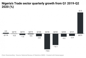 The trade sector, Nigeria’s second-biggest by contribution to GDP, returned to positive growth in the second quarter (April-June) of 2021, ending eighth consecutive quarters of contraction, thereby escaping an economic depression.