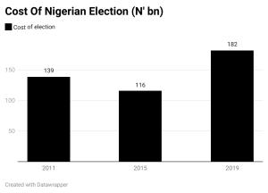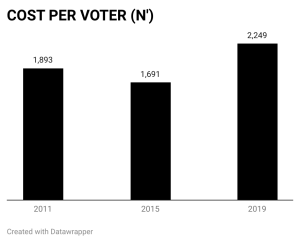 For instance, Nigeria spent a total of N139 billion conducting the 2011 general election for 73.5 million registered voters. The election budget for that year was based on an average cost of N1,893 or $9 per voter.