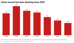 That’s less than the 35 percent and 43 percent recorded in the 2019 and 2015 presidential elections respectively.