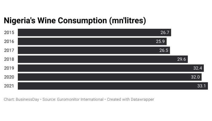 The disposition of Nigerians towards wine consumption is growing as consumption in 2021 was 33.1 million litres, the highest since Euromonitor International, a London-based market research company started compiling the data in 2015.