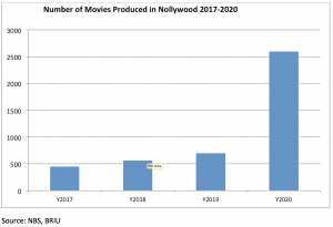 According to the National Bureau of Statistics (NBS), the total number of Nollywood movies produced in 2017 was 450. It increased to 565 in 2018, 700 in 2019, and despite the COVID-19 pandemic in 2020, it was the year with the highest production of movies at 2599, were produced relative to the previous years. Between 2017 and 2020, movie production increased by 478 percent when measured in terms of number of movies produced.