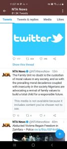Also important to note that the government had also threatened to prosecute people downloading VPN, a Virtual Private Network (VPN) with the aim to bypass the ban on Twitter. NTA which has its headquarters in Abuja, would ordinarily be tweeting from Nigeria and the tweets it has been making on Monday only confirms that it also bypassed the government order on VPN.