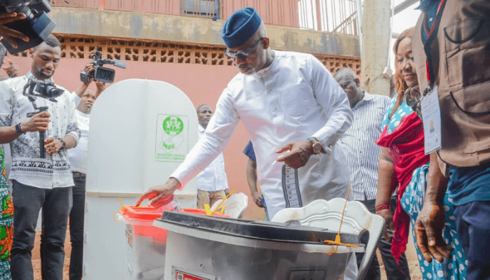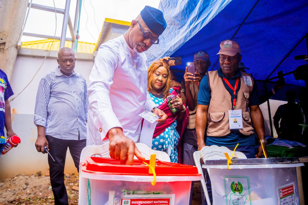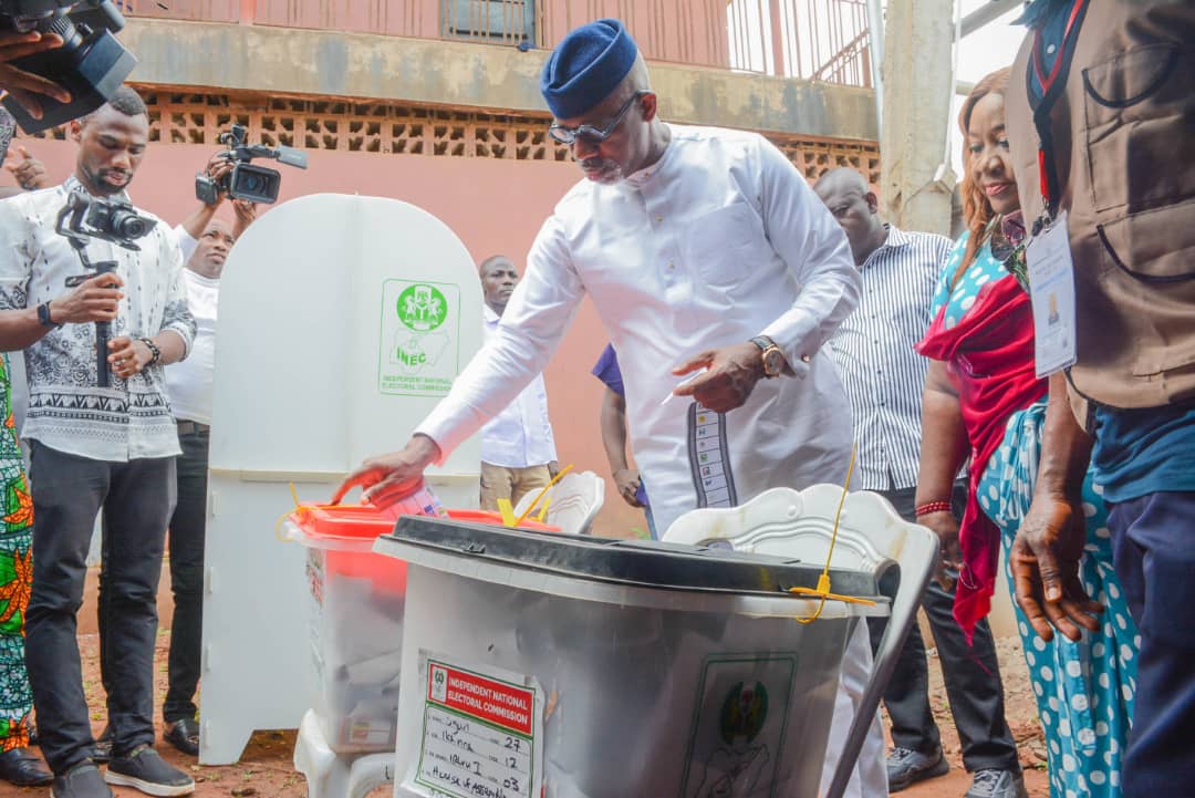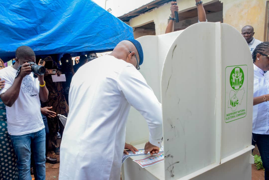 Ogun State Governor, Prince Dapo Abiodun casting his vote at Ward 3, Polling Unit 2, Ita Osanyin, Iperu-Remo in Ikenne Local Government Area of the State on Saturday.