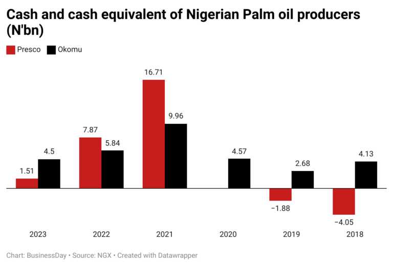Okomu Oil Palm Company Plc and Presco Plc, the biggest palm oil producers in Nigeria, recorded a decline of 56.1 percent in their cash and cash equivalent balance for 2023.
