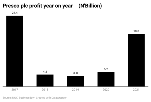 Presco’s gross profit almost doubled in 2021 by 95 percent to N31.2 billion from N16 billion in December 2020 while Profit before tax rose by a whopping 172 per cent to 23.7 billion from N8.7 billion in the preceding year.