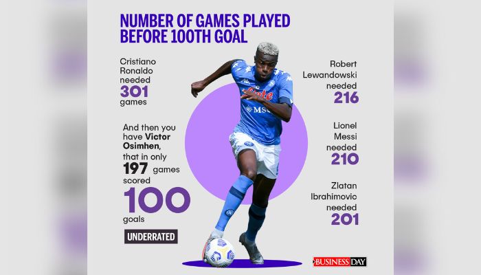 Among the players Osimhen surpassed are Robert Lewandowski who played 216 games before scoring 100 goals; Lionel Messi, played 210 games before netting the 100th time, Christiano Ronaldo, had his 100th goal after 301 games, and Zlatan Ibrahimovic, needed 201 matches to hit the 100 goals spot.