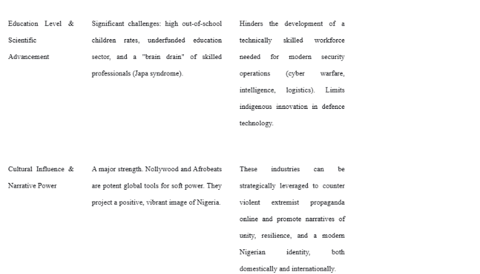 Socio-cultural power refers to the intangible aspects of a nation’s society, such as national morale, unity, prevailing ideology, and education level, all of which contribute to a nation’s resilience and ability to withstand security challenges. A cohesive society with a strong national character and high morale can endure hardship and support its government’s security policies, making it a more resilient and powerful state. The level of public education and scientific advancement also plays a crucial role in developing a skilled workforce and fostering innovation relevant to national security. Nigeria’s diverse society, if unified, presents a significant strength in confronting security threats. President Tinubu’s vision of a “just and democratic society” implicitly aims to foster national morale and cohesion. Promoting education and facilitating inter-ethnic dialogues are crucial for countering separatist tensions and building a unified front against internal and external threats. Furthermore, leveraging cultural industries like Nollywood and promoting cultural exports can actively combat extremist narratives and foster a positive national identity, contributing to socio-cultural resilience.