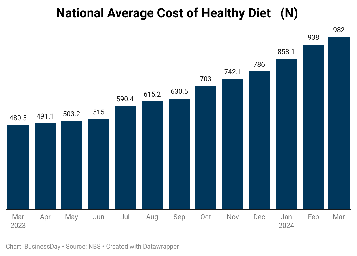 From N938 in February, Nigerians required N982 on average in March to access essential nutrient requirements in their diet, a 4.7 percent increase.