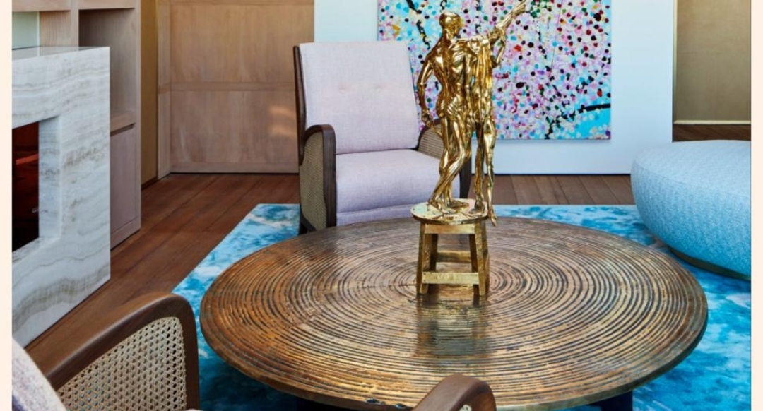 Take the pedestal dining table, a circle of polished amboyna (the rare burl wood of a pterocarpus tree) inset with a disc of malachite, the height of which can be raised or lowered by means of a remote control. Or the immense crescent-shaped, cushion-strewn bouclé sofa in one of three sitting rooms, which rests on discreet rails etched into the silken carpet so that it can be rotated to face the giant onyx fireplace, the 100-inch TV screen or the terrace. There are also six “lighting scenarios” to improve on nature, ensuring rosy dawn or amber sunset, whatever the weather or time of day.