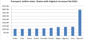Interstate bus transport fare increased by 44.34 percent on the average between February 2020 and February 2021. The most increase was in Kaduna, Bauchi and Enugu states while the least growth in interstate transport fare was in Borno, Benue and Abuja.