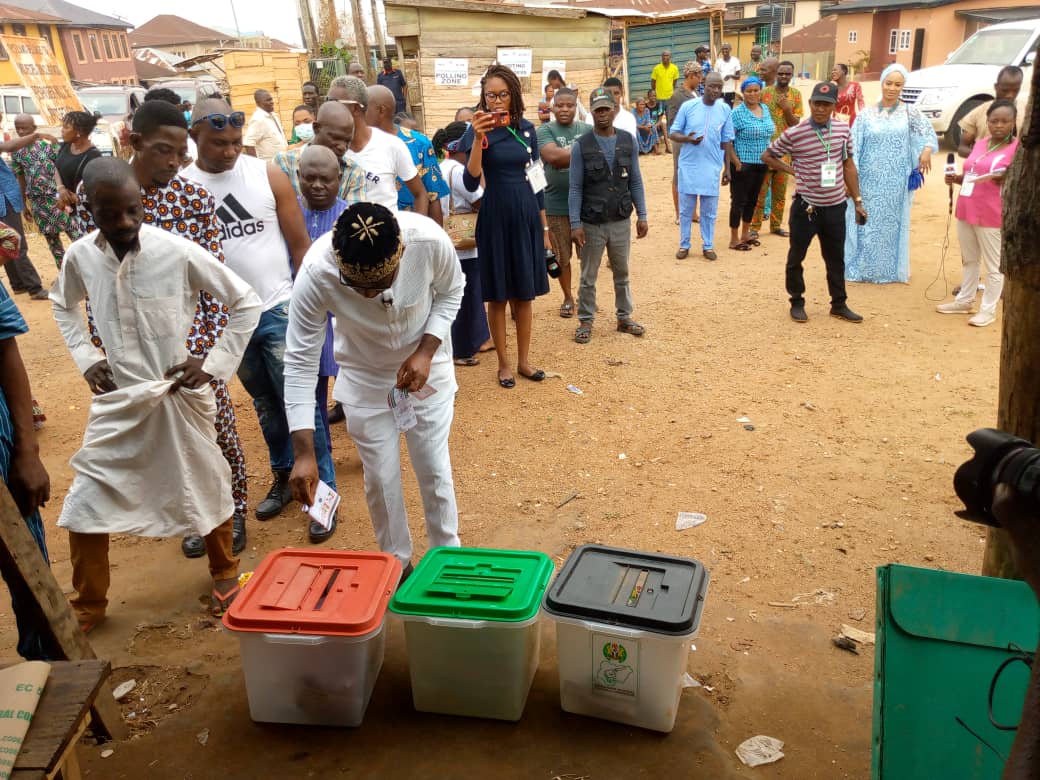 Picture of the SDP presidential candidate, Adewole Adebayo casting his vote at unit 19, ward 10, Barracks Road, Ondo City.