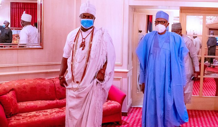 The president met behind closed doors with the Ooni of Ife, Enitan Ogunwusi, as part of efforts at resolving the crisis.