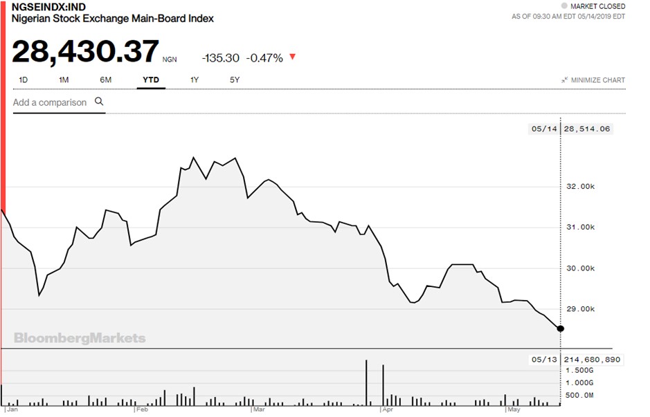 Since the conclusion of the 2019 general elections, negative sentiments of the market have driven the all share index performance down by 13.05 percent to 28,430.37 points as at the close of market on Tuesday, 4.95 percentage points lower than FY 2018 bearish market performance of 18 percent.
