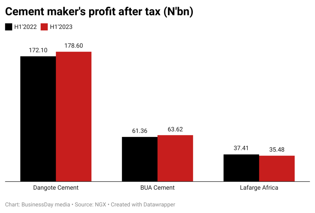 The cement makers which are Dangote Cement, BUA Cement, and Lafarge Africa recorded cumulative profit after tax to N227.7 billion in the first half of 2023, a 20 percent increase from N270.87 billion.