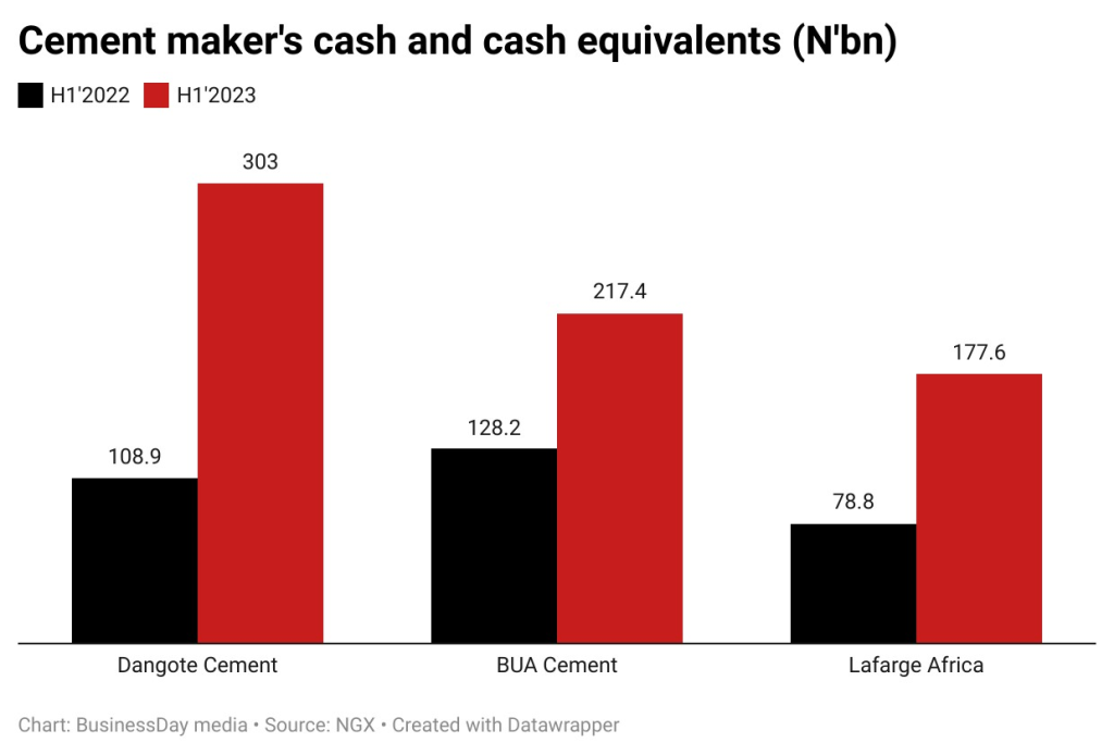 Cement makers grew liquidity by 121 percent with a record of N697.99 billion cash and cash equivalents in the first half of 2023 from N315.88 billion in the same period of 2022.
