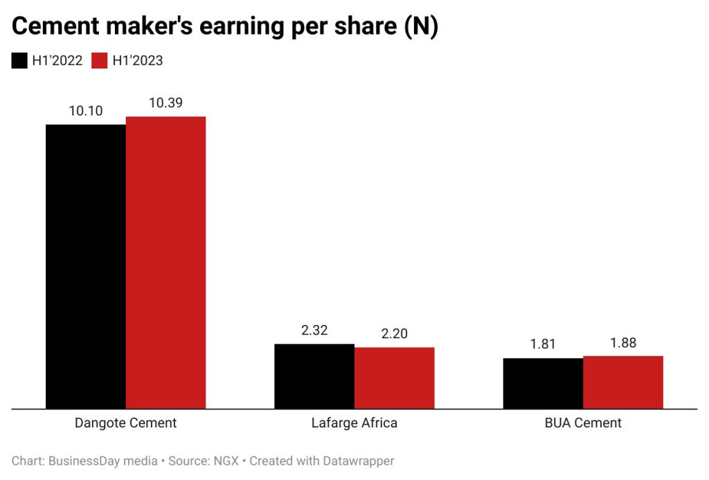 Dangote Cement’s earnings per share amounted to N10.39 per share in the first half of 2023 from N10.10 per share in the first quarter of 2022.