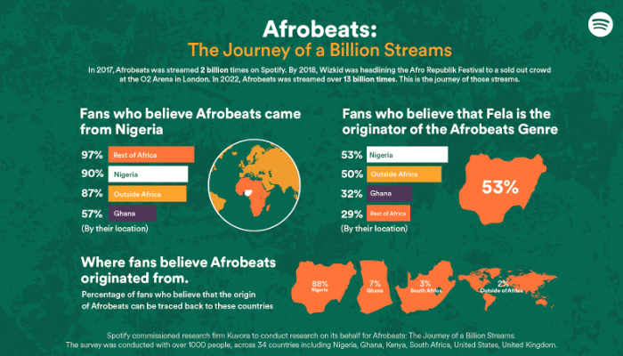 According to the streaming platform, the site will act as a repository for this cultural phenomenon housing text, infographics and visual elements, including Spotify streaming data and results from the Spotify-commissioned April 2023 Afrobeats survey. The survey, conducted by research firm Kuvora, tracks the rise of Afrobeats and its cultural impact over decades.