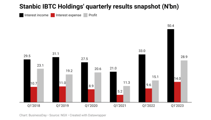 Stanbic IBTC has recorded a 53 percent growth in interest income to N50.4 billion in the first quarter of 2023, driven largely by loans and advances to customers, interest on investments.