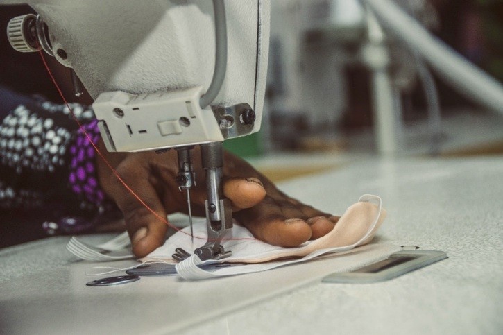 A cloth mask under production (sewing). The opportunity led to the production of other products such as medical scrubs, isolation gowns, medical gowns, lab coats — things normally imported.