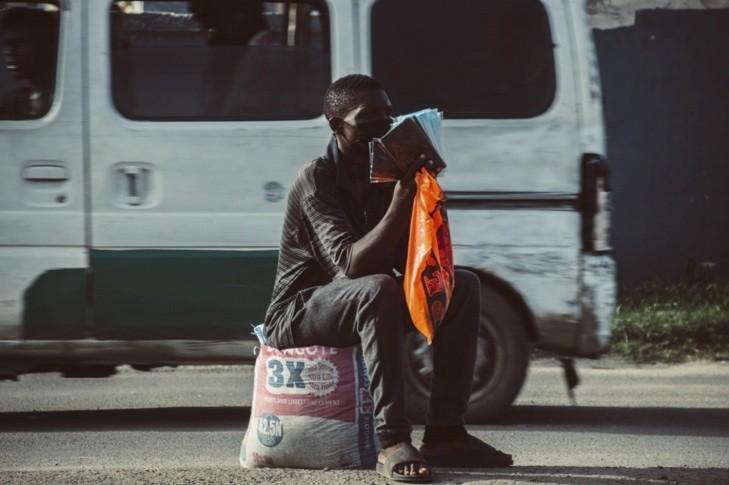 A mask-hawker sits on a sack of sand, tired from running after clients in vehicles seeking entrance at Landmark Event Centre.