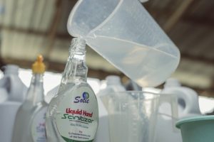 Briggs mixes raw materials for the production a 50-litre quantity of liquid soap in a 180-litre container. “I supply about 2,000 litres in of soap in a month and I hope to increase it 50 litres in a month. Overall, the business is profitable, though with little margins mainly because I am is yet to increased my prices, despite maintaining a high level of quality in her products,” she explains.Briggs fills a branded container with liquid sanitiser she had just produced. “This sanitiser can also be used to disinfect surfaces,” she said. “you can spray it on someone too.”