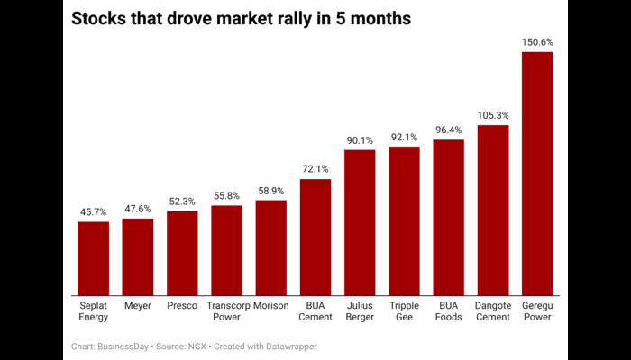 Driving the stock rally were companies including Geregu Power, which jumped 150.6 percent, Dangote Cement (105.3 percent), BUA Cement (72.07 percent), BUA Foods (96.4 percent) and Julius Berger (90.07 percent).