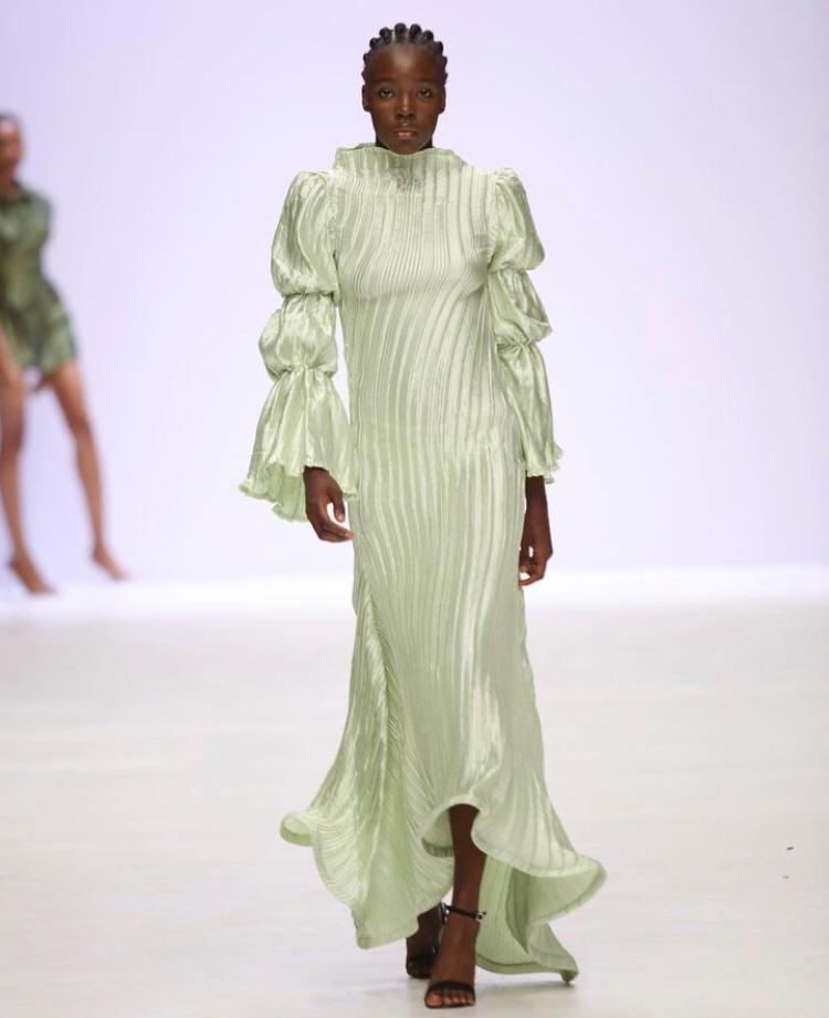 Birthed by the love of her country Nigeria, Tia Adeola used pallet of green white and black with feathered trimmings, see through fabrics, and urban designs.