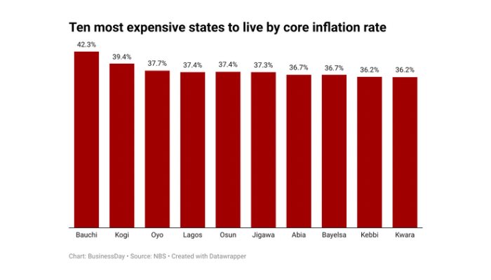 Bauchi is the most expensive state in Nigeria, with core inflation of 42.3 percent and food inflation of 34.35 percent. Month-on-month, Bauchi’s core inflation stood at 3.75 percent, while food inflation stood at 2.94 percent.
