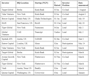 Target Global is the second most active investment company so far, although its cheques have only gone to one fintech company, Kuda Bank. Target Global has participated in the last three funding rounds closed by Kuda Bank and taken the lead and co-lead positions in two of the rounds.