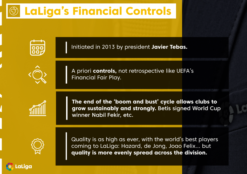 Secondly, the centralized sale of TV broadcast rights which began in 2015 have transformed the financial realities of almost all LaLiga clubs, ensuring that the league’s rapidly growing broadcast income – which is up from €600 million in 2015 to €1.865 billion today – is more evenly spread across its clubs. Clubs like Athletic Club, for example, have seen their broadcast incomes rocket from €17 million to €71 million in just a few years, while others such as Real Betis have seen their relative power in the market increase to the point to which they could beat a host of top European sides to the acquisition of French World Cup winner Nabil Fekir from Lyon this past summer.