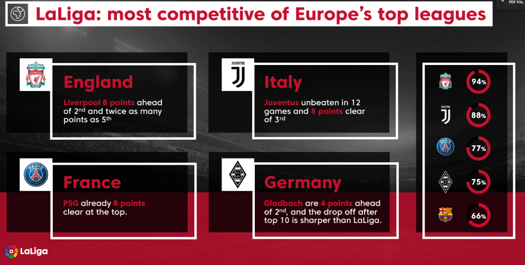 Leaders Barcelona have picked up 66% of all possible points this season, reflecting just how equal the competition is and how difficult it is to break away from the pack in LaLiga Santander today. The statistics cannot say the same about the rest of Europe’s top five leagues, where Liverpool (94% of possible points), Juventus (88%), PSG (77%) and Borussia Monchengladbach’s (75%) points tallies suggest a different picture in England, Italy, France and Germany.