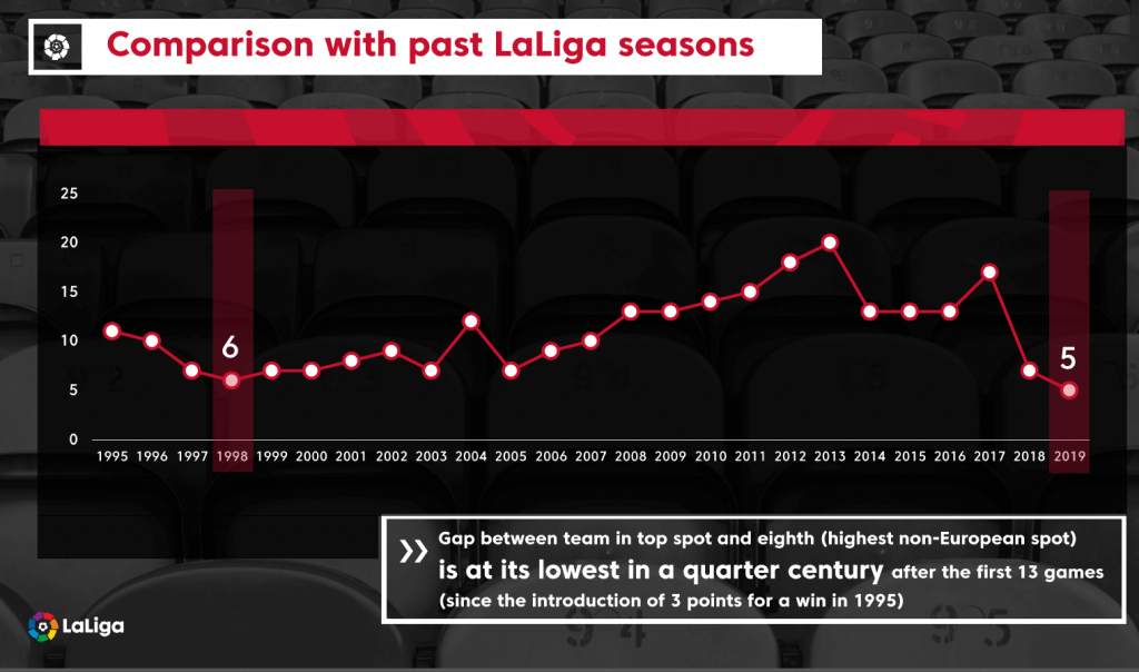 And the five points which separate the teams in a European qualification place – from Barcelona in first to Getafe seventh – after thirteen games is the lowest in a quarter of a century. The previous record of six points was set back in 1998/99, a season in which a Barcelona side captained by a certain Pep Guardiola ran out eventual winners.