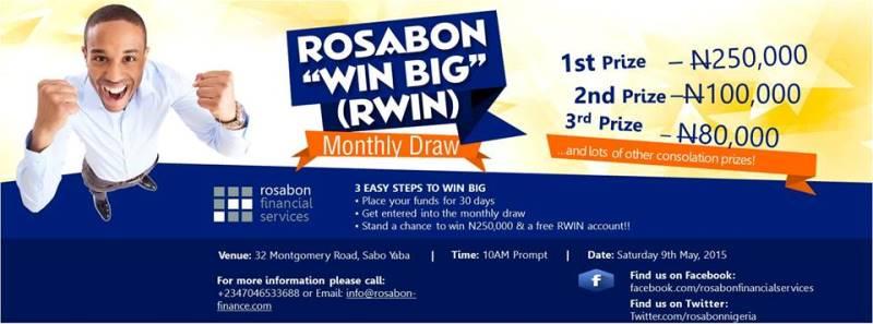 Imagine what N250, 000 can do for you right now. Yes I mean this very moment! Would you want to go shopping, pay for a trip or plantowards a long term goal? If the answer is yes, then your Rosabon Win-big monthly note (RWIN) is just a ticket away.