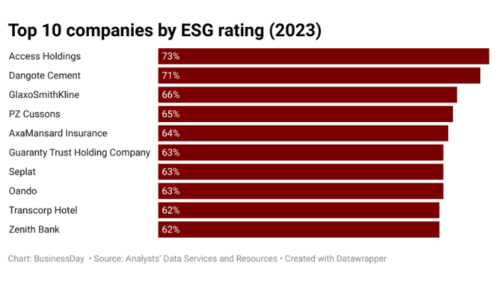 Access Holdings, Dangote Cement, GlaxoSmithKline Consumer Nigeria, PZ Cussons and AxaMansard Insurance were the top five companies that got the highest Environmental, Social, and Governance (ESG) rating for 2023.