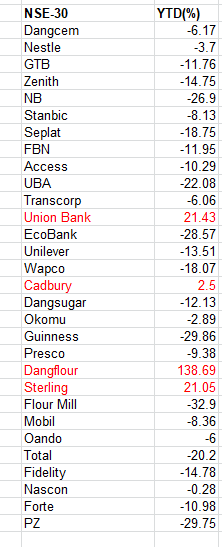 Among the 30 most-capitalized stocks on the Lagos Exchange, four including Nigeria’s third-largest miller, Dangote Flour, Cadbury, Sterling Bank and Union Bank, delivered most value to investors, and outshined the benchmark index, which has returned 6.6 percent losses on Monday.