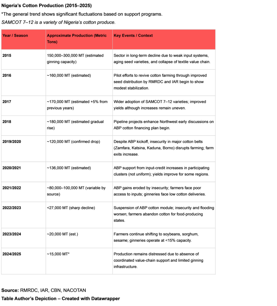 Cotton production fluctuated dramatically over the past decade, underscoring the sector’s fragility. In 2015, production fell to between 150,000 and 300,000 metric tons as ageing seed varieties and a collapsed value chain weighed heavily. A modest rebound followed in 2016 and 2017, driven by improved seed distribution and the adoption of SAMCOT 7–12 varieties. By 2018, private ginners had returned to northern states, lifting confidence and yields. That momentum was short‑lived: flooding in 2019/2020 slashed output to 120,000 tons. A brief recovery in 2020/2021 under the Anchor Borrowers Programme gave way to steep declines from 2021 onward, with insecurity and poor input delivery dragging production to a projected 15,000 tons by 2025.