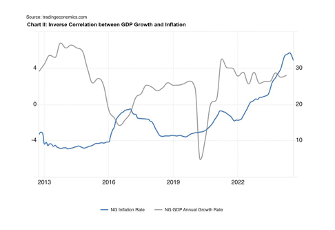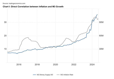 Our concern starts with the 100% increase in money supply in the past year to 107 trillion naira by August 2024. Our analysis Chart I shows a direct correlation over the last 10 years between the increase in money supply and a spike in inflation.