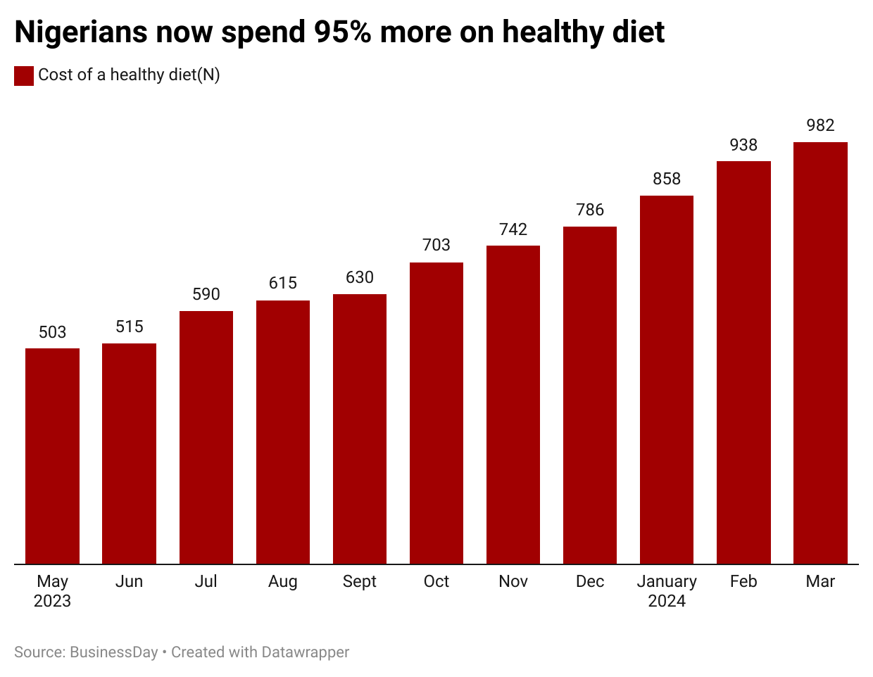 NBS data also shows that Nigerians spent N982 on a healthy diet in March, costing 95 percent more than N503 after one year of the Tinubu-led administration.
