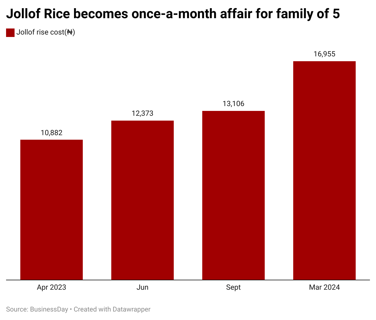 This equals 53 percent of the N30,000 minimum wage, meaning that a minimum-wage earner can only cook jollof rice once a month.