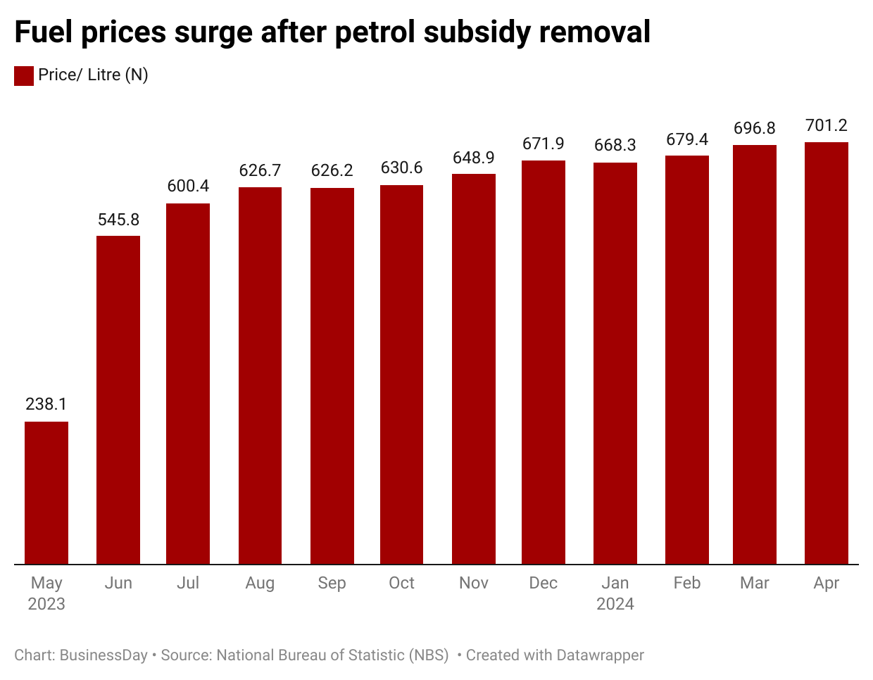 Data gleaned from the NBS shows that the average retail price paid by consumers for petrol in April 2024 was N701.24, a 176.02 percent increase when compared to the value recorded in April 2023, before President Tinubu’s assumption of office, which was N254.06.