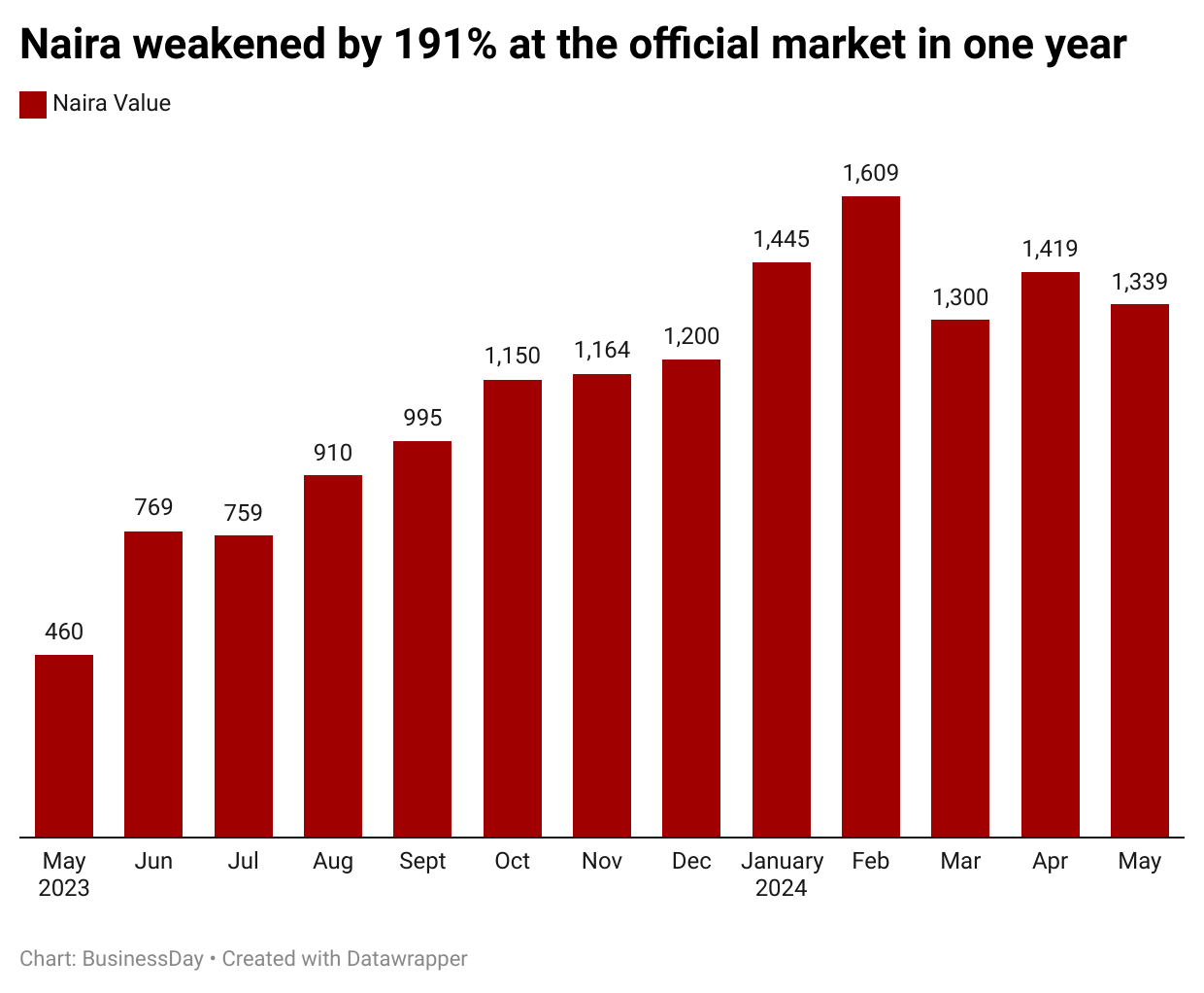 The report, titled ‘Crisis at the Table’, by SBM Intelligence, an Africa-focused geopolitical research and strategic communications consulting firm, said that the primary trigger for the increase was the naira depreciation, which moved from a monthly average of N460 to a dollar in May 2023 to a monthly average of over N1,400 in May 2024.