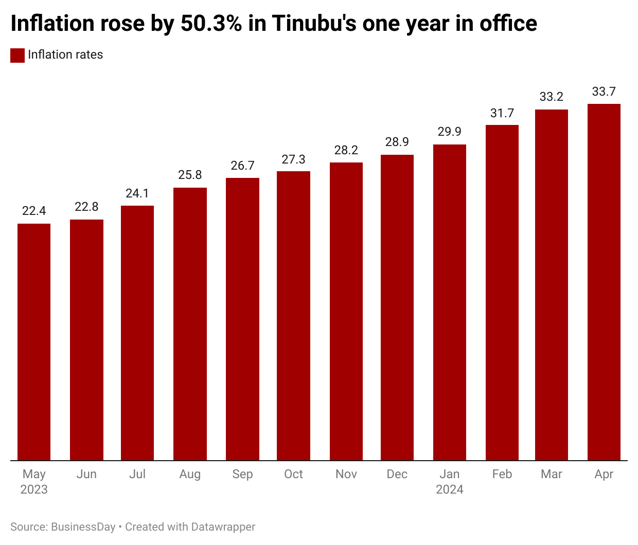 Nigeria’s headline inflation under the Tinubu-led administration has spiralled to 33.70 percent in April, the highest after a year of inaugurating successive governments since 1999, BusinessDay’s findings show.