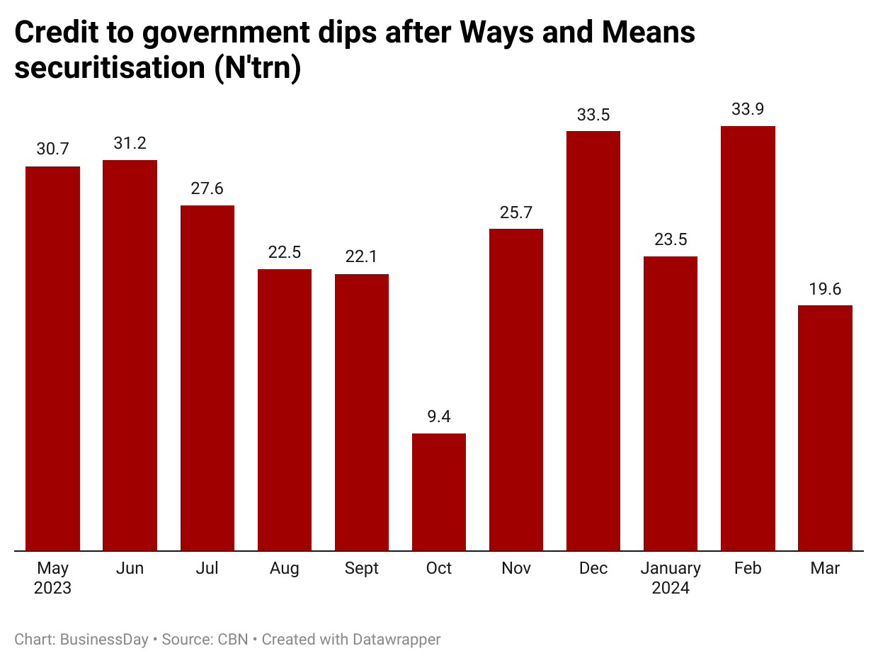 Credit to the government dipped to a one-year low in the first quarter of 2024; it declined by 28.8 percent to N19.59 trillion in March 2024, down from N27.53 trillion recorded in the corresponding period of March 2023.