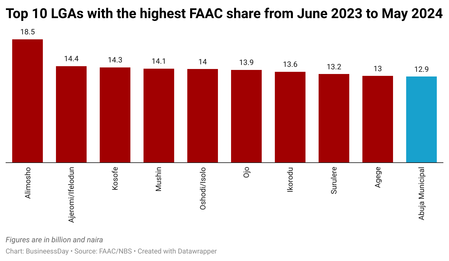 BusinessDay findings showed that Alimosho Local Government Area in Lagos State, which is the most populous LGA in Nigeria, received the highest FAAC share among the 774 local councils in the country between June 2023 and May 2024.