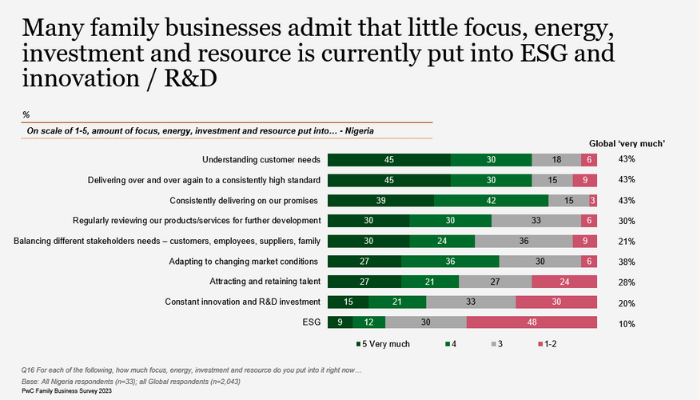 A recent PwC survey shows that despite 85 percent of Nigerian family businesses having a clear purpose, only 57 percent communicate this to external stakeholders, particularly customers. To truly manifest their purpose, family businesses should demonstrate them, especially in interactions with customers.