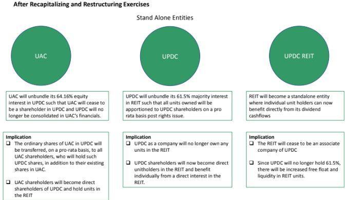 After the recapitalization and restructuring, each UACN shareholder will hold shares in three separate entities – UACN, UPDC and the UPDC REIT benefitting from the prospects of each.